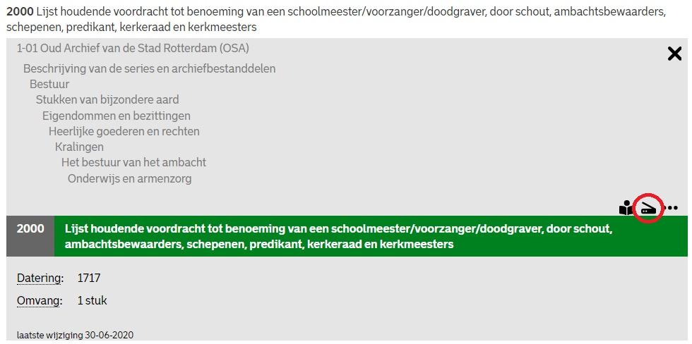 Scannen op aanvraag kan alleen als er bij het archiefstuk een icoon staat: het scannen op verzoek-icoon. Wilt u dat de scan op de website komt, neem dan de 3 volgende stappen: