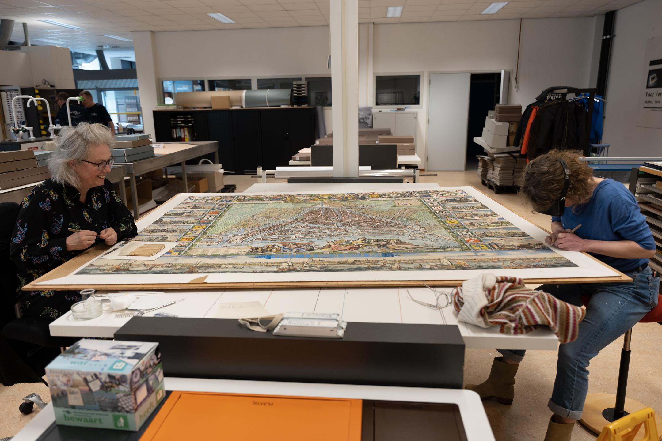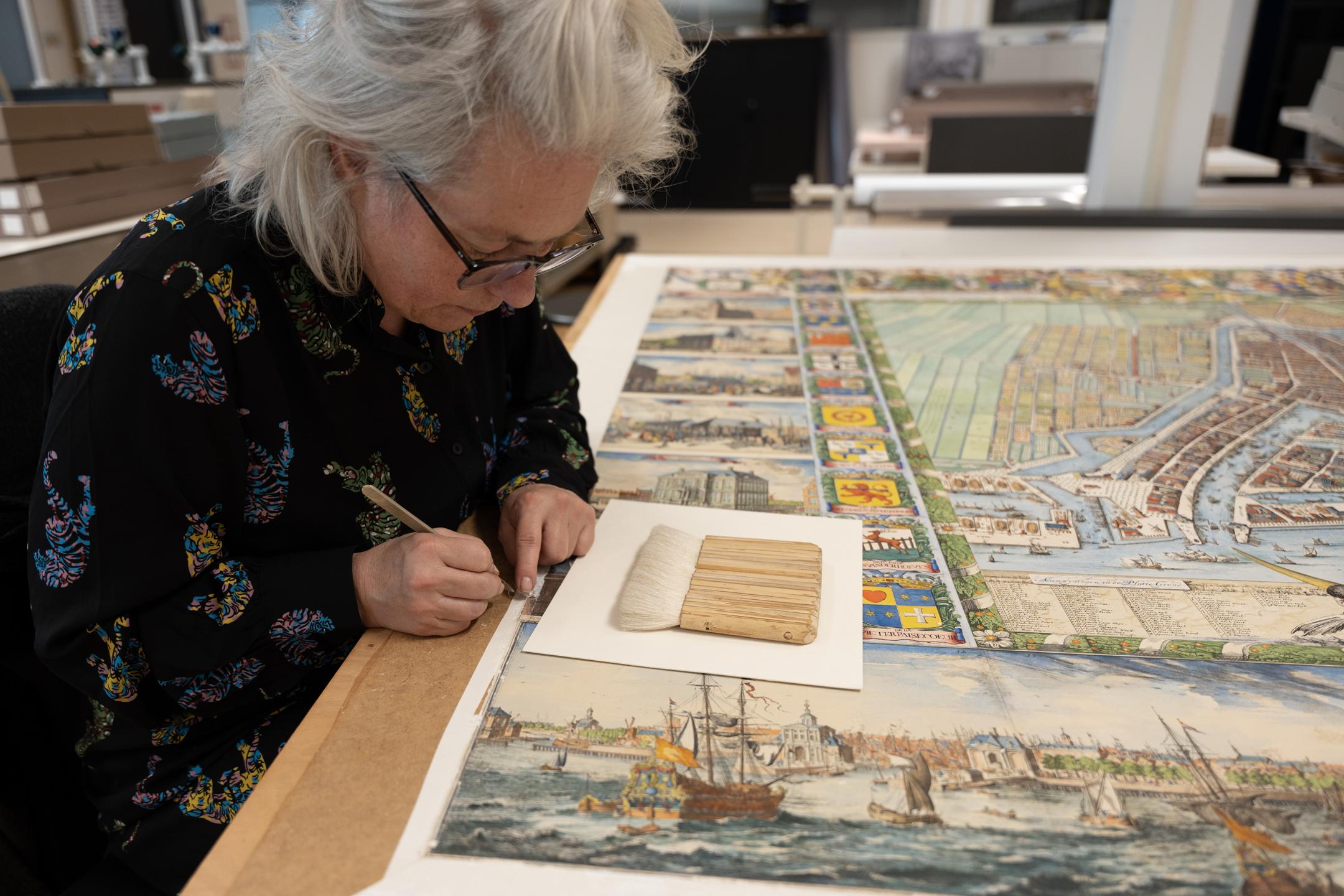 Zodra het stadsarchief een bruikleenverzoek krijgt, informeert Lonneke alle afdelingen. ‘De aanvraag komt meestal binnen via de studiezaal, soms is daar ook al vooronderzoek gedaan. Vaak is er een afgebakende objectenlijst; de kunstinstelling heeft al bepaald welke objecten uit het archief zij tentoon willen stellen. Ook komen er nog geregeld zoekvragen binnen. Dan help ik mee met aanvullend onderzoek. De afdeling Preserveren, Conserveren en Restaureren (PCR) speelt een grote rol binnen het proces. De afdeling adviseert over de staat van het object en of het tentoongesteld kan worden. Bij een negatief advies proberen we wel altijd een alternatief te bieden. Bij een positief advies maakt een restaurator het werk klaar om te worden tentoongesteld. Soms hoeft een object alleen te worden schoongemaakt of gevlakt*, in andere gevallen is een restauratie noodzakelijk, zoals bij De Vou. Bij De Vou viel het meteen op dat het passe-partout op het werk was geplakt en een deel van de afbeelding afschermde’, vertelt Lonneke.