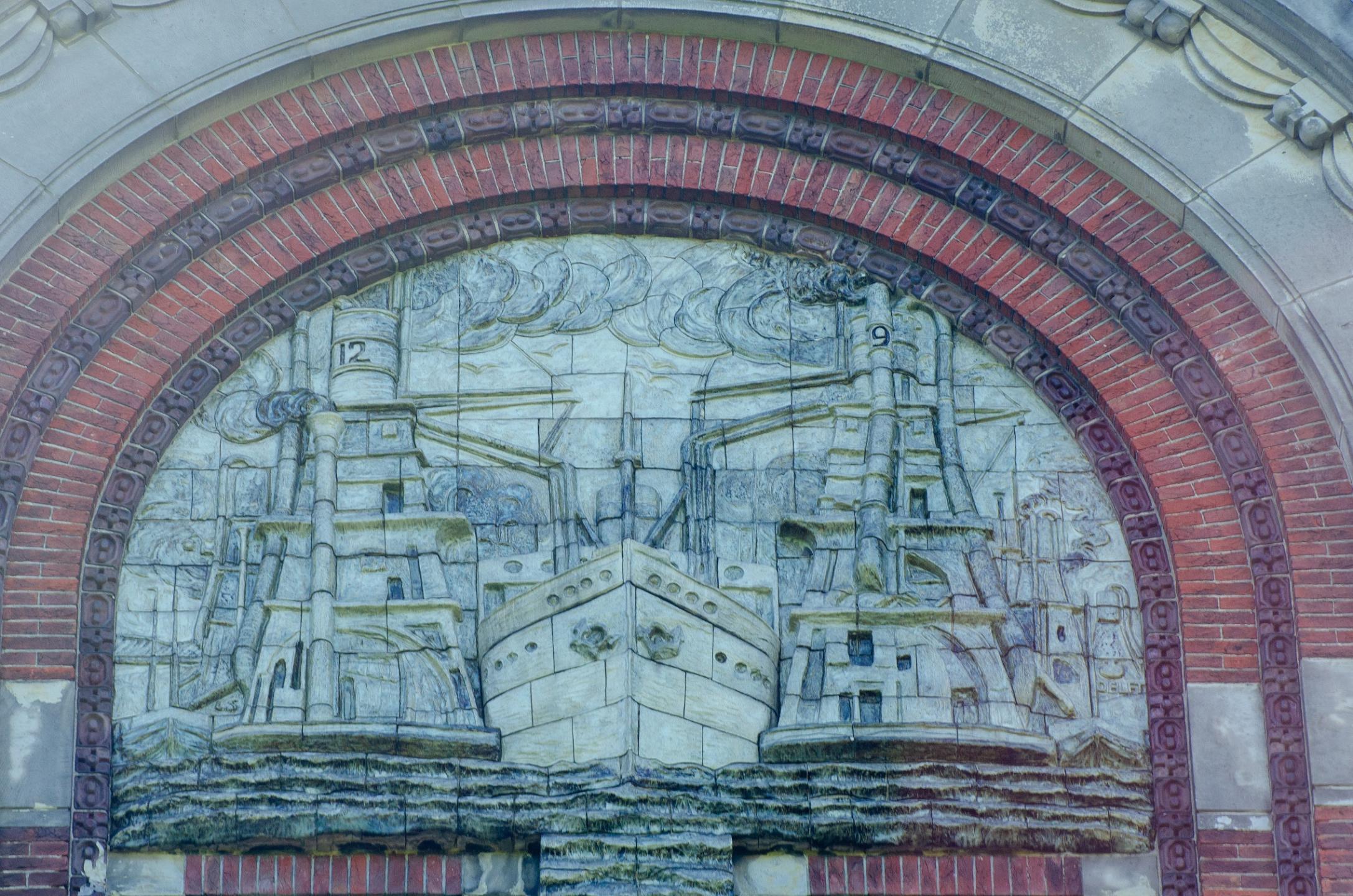 Ook in de decoratie straalt het kantoor luxe uit. Boven in de voorgevel prijkt een keramisch reliëf met een zeeschip dat wordt gelost door graanelevators. Het is ontworpen door de bekende Rotterdamse kunstenaar Bernard Richters en uitgevoerd door de Porceleyne Fles in Delft. Een ander Delfts bedrijf, atelier Prinsenhof van Jan Schouten, levert glas-in-loodramen voor de directiekamer. Hierop is onder meer te zien hoe graan met de hand wordt gelost vóór de komst van de elevator. De ramen worden tegenwoordig bewaard door Museum Rotterdam.