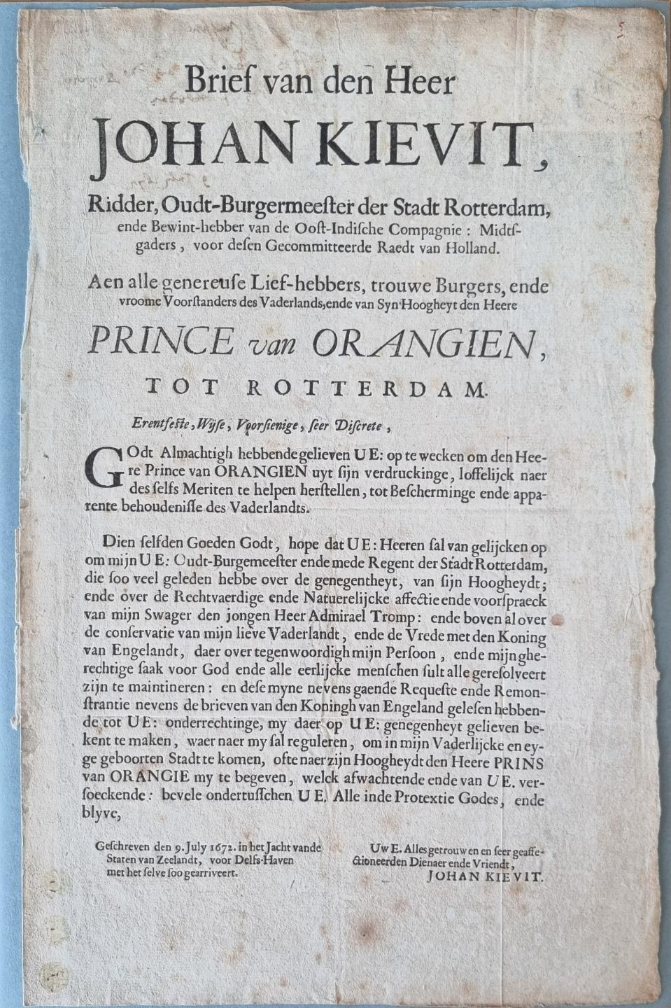 De lijst van ambten die Johan Kievit, afkomstig uit een rijke Rotterdamse brouwersfamilie, in de jaren 1660-1680 in Rotterdam bekleedde is indrukwekkend. Zo was hij onder meer lid van de vroedschap, pensionaris, burgemeester, tresorier (‘schatbewaarder’, degene die gaat over de financiën), weesmeester, schepen, advocaat-fiscaal (douanebeambte) bij de Admiraliteit en bewindhebber van de Oost-Indische Compagnie. Veelal waren het posities voor een korte periode, die keer op keer verlengd konden worden. Zo reeg Johan Kievit de baantjes aaneen. Ook had hij namens Rotterdam zitting in de Gecommitteerde Raden, in feite het dagelijks bestuur van de provincie Holland. Hiervoor betrok hij een woning in Den Haag.