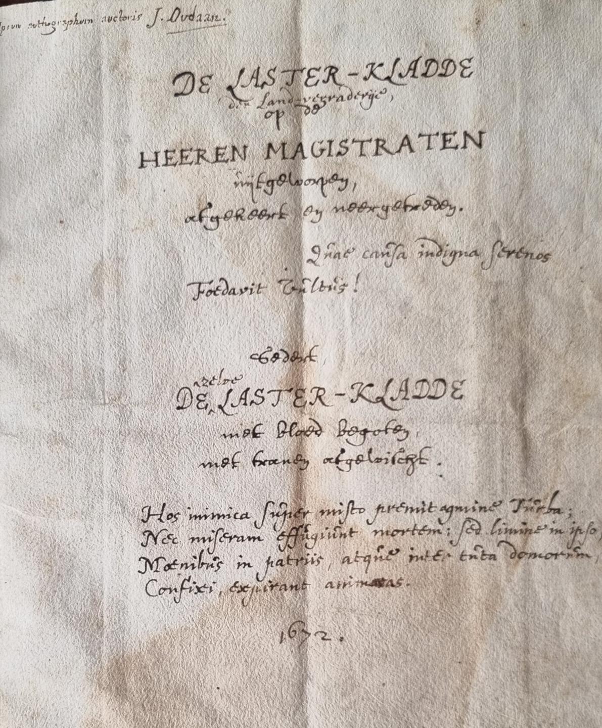 Zijn ervaringen op de dag van de moord verwerkte hij in het pamflet De laster-kladde der Landverraderye, met daarin een gedetailleerd verslag van het gebeuren. Het Stadsarchief bezit van dit pamflet een handschrift, mogelijk van Oudaen zelf. In 1673 werkte hij zijn ideeën over de moord, en in het bijzonder over de schuldigen en medeplichtigen, verder uit tot een toneelstuk: de Haagsche Broeder-Moord. Het treurspel verscheen echter pas twintig jaar na Oudaens dood, in 1712. Opnieuw anoniem, en met een fictief drukkersadres.