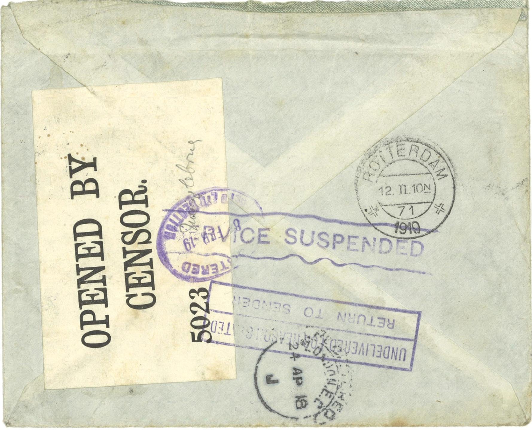 Wat is er aan de hand? Veel geheims bevat de envelop niet: een uitnodiging en een agenda voor een vergadering. Belangrijker is dat door de oorlog de scheepvaartverbindingen nagenoeg zijn stilgevallen. Duitse onderzeeboten maken de Noordzee, de Atlantische Oceaan en zelfs de Middellandse Zee onveilig, zodat geen schip naar de Zwarte Zee kan varen. Maar zelfs als de oorlog op 11 november 1918 wordt beëindigd door de Wapenstilstand, kan de brief niet door naar Odessa. De Oekraïners hebben van de chaos rond de Russische Revolutie gebruik gemaakt om zich onafhankelijk te verklaren. De regering in Moskou reageert daarop met een grootscheepse invasie op 7 januari 1919. Een maand later stuurt de Londense censor de brief van de GEM maar terug naar Rotterdam, voorzien van het stempel: “Service suspended”.