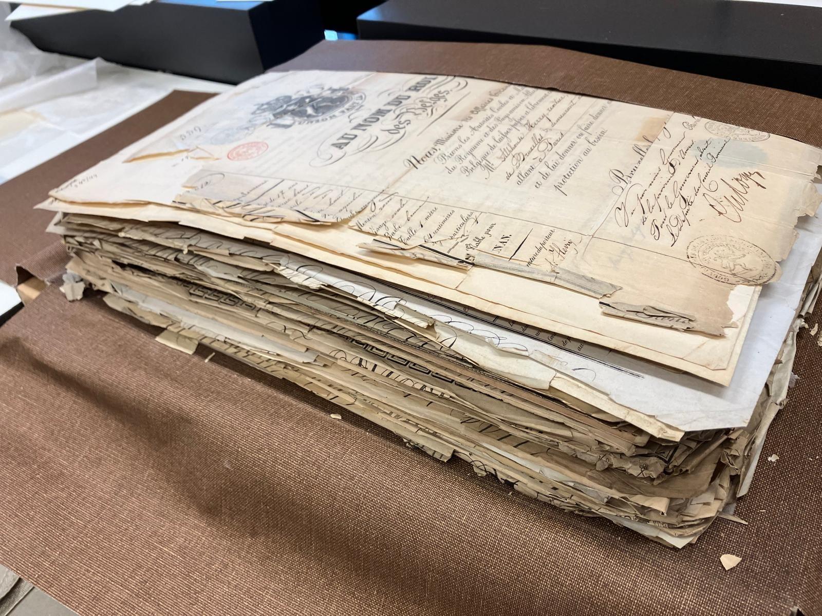 De slechte materiële staat vormde hiervoor een belemmering [zie figuur 1]. Er werd een restauratieplan gemaakt waarna er in twee maanden tijd zo’n 5000 paspoorten zijn gerestaureerd. De documenten zijn gereinigd, gevlakt en de scheuren zijn gerepareerd [zie filmpje verder op deze pagina]. Hierbij is de nadruk gelegd op de leesbaarheid en stabiliteit van het materiaal.
