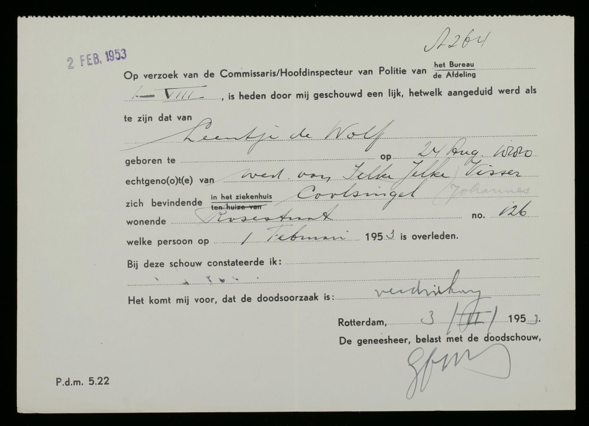 In de Rosestraat kwam ook het enige Rotterdamse rampslachtoffer om het leven. Mevrouw Leentje Visser-De Wolff verdronk in haar benedenwoning op nummer 126. Door de hoge waterstand konden omstanders wel haar hulpgeroep horen, maar haar niet meer op tijd uit de woning halen. Haar buurvrouw kon gelukkig wel worden gered door een dappere buurtbewoner.